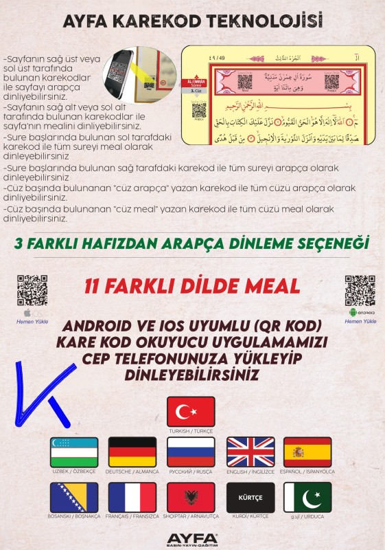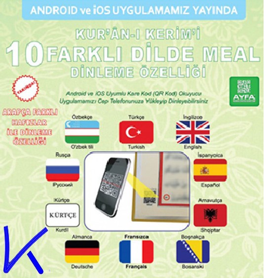 . Kare kodlu 10 farklı  dilde meal dinleme özelliği ( türkçe ve fransızca dahil...)
